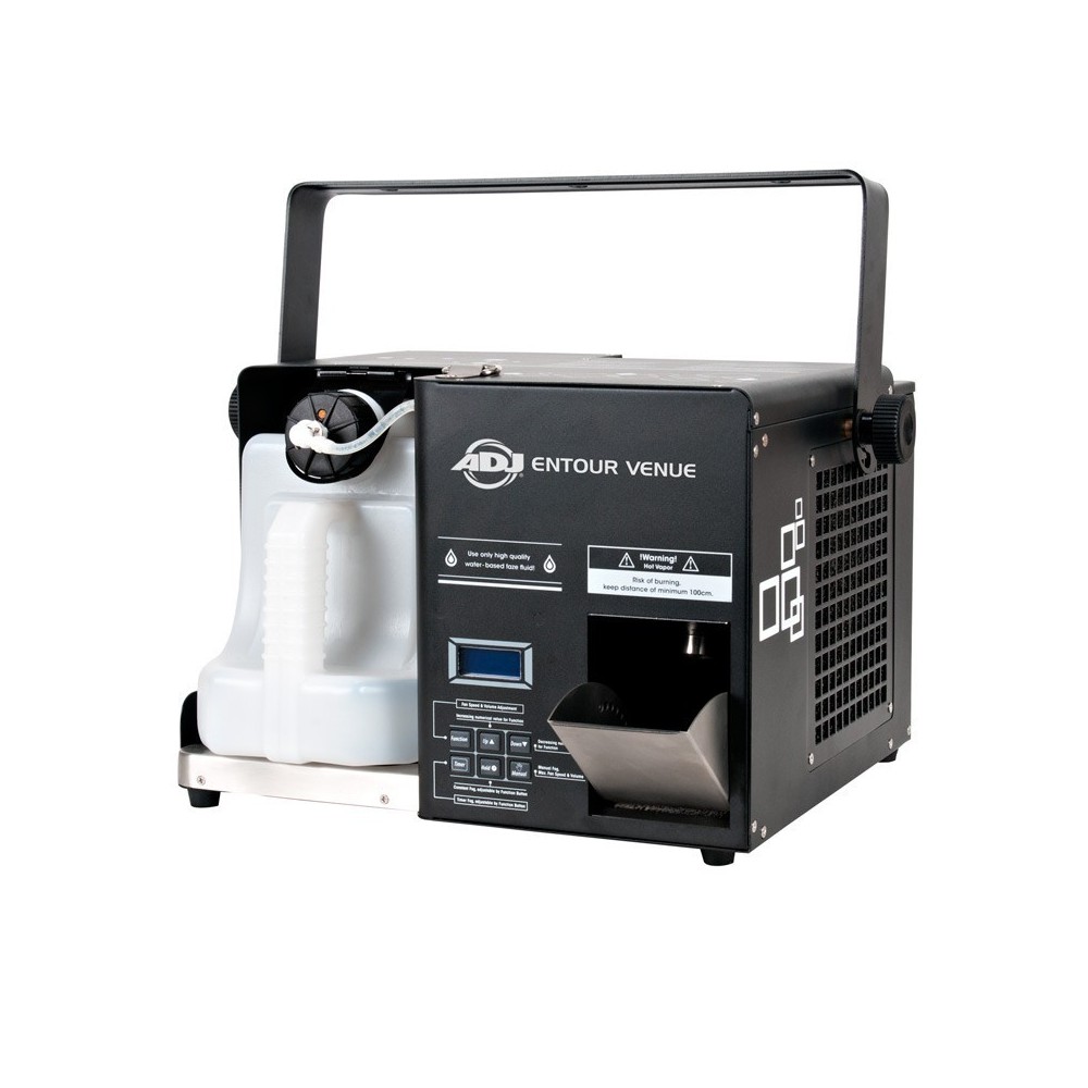 Entour Venue marki ADJ to profesjonalna wytwornica mgły typu touring faze. Zaletą profesjonalnej maszyny jest bardzo szybka gotowość do pracy. Kolejnym atutem maszyny to duży wyraźny wyświetlacz z możliwością ustawienia czasu wydmuchu, bezustanny wydmuch oraz manulane ustawienie wydmuchu. Wejście podłączeniowe to 3-pin, 5-pin DMX oraz zasilanie PowerCon. Wyłącznie użycie wysokiej jakości płynów na bazie wody.