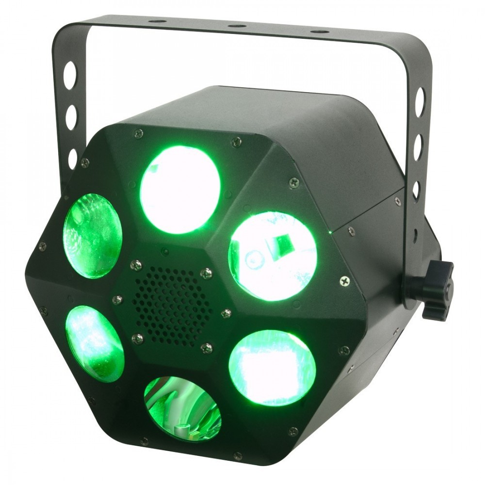 - Bardzo jasny efekt Moonflower z 32-watową diodą Quad-Color LED 4-w-1 (czerwony, zielony, niebieski, biały) w technologii umożliwiającej płynną zmianę koloru wiązki światła