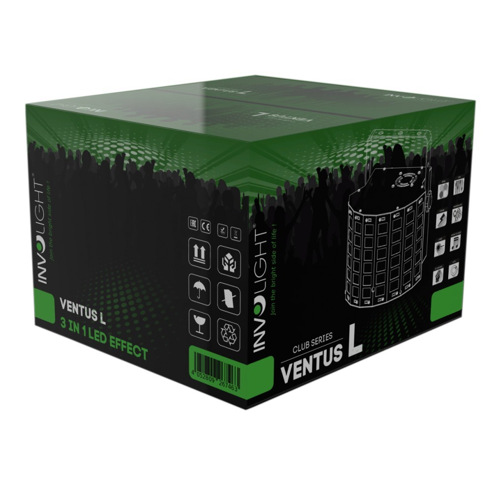 Wszystkie urządzenia INVOLIGHT serii VENTUS charakteryzują się nowymi rozwiązaniami "FX3-Technologies" !. Oznacza to, że urządzenie posiadają wiele efektów w jednej bryle, przy zachowaniu mobilności, a rządzenia są dostarczane w standardzie z pilotem na podczerwień dla ułatwienia pracy.