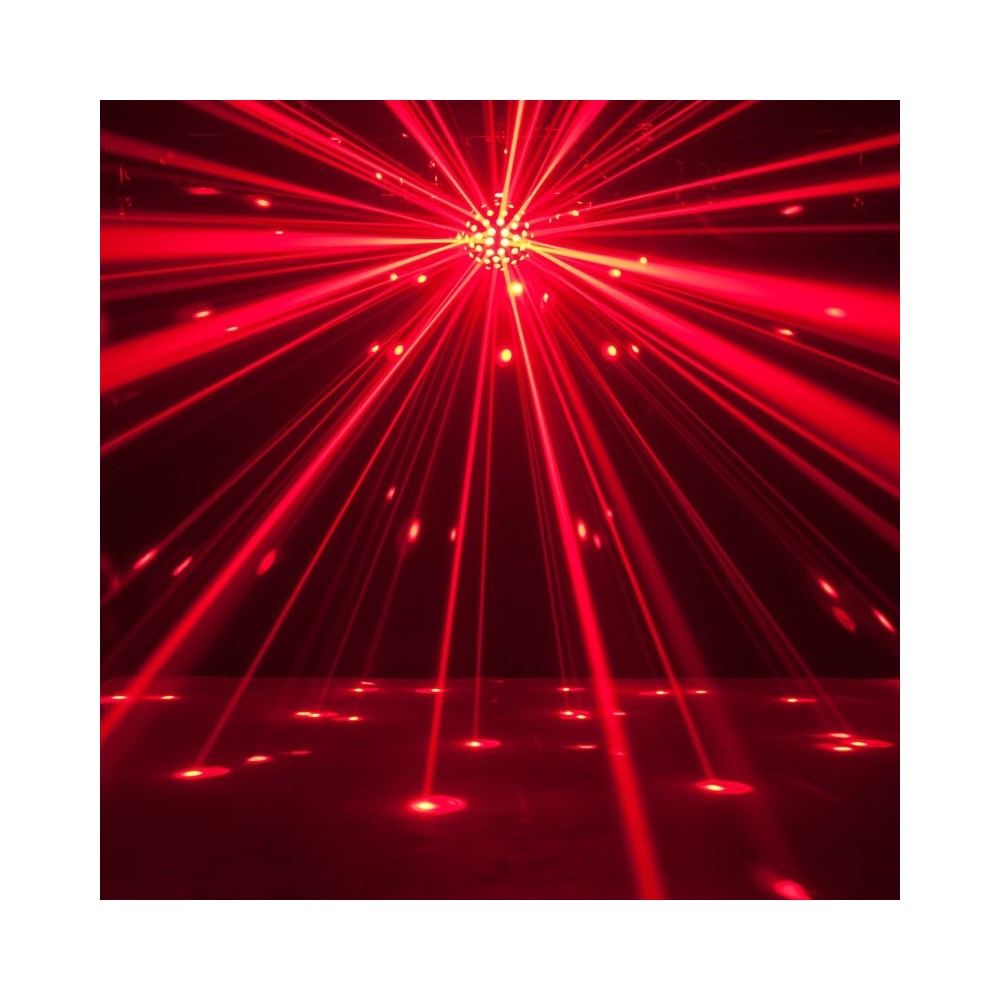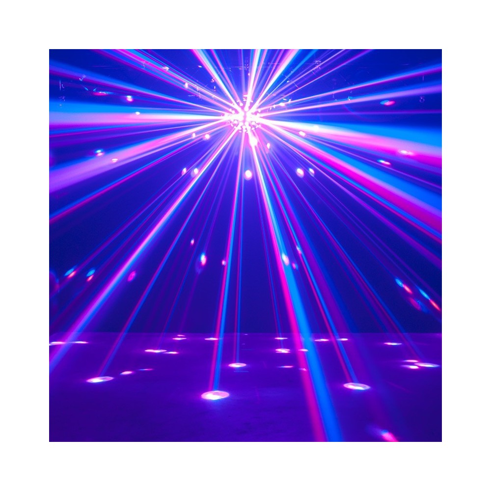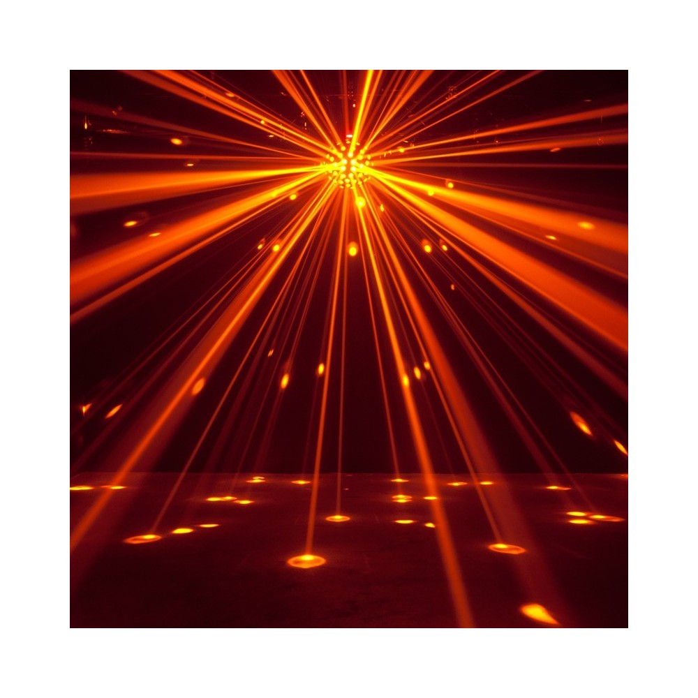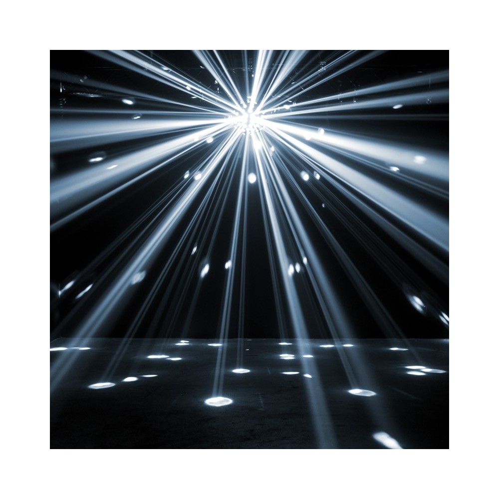 Starburst jest świetnym efektem LED przypominający kulę lustrzaną, która obraca się w rytm muzyki i wyświetla ostre multikolorowe promienie świetlne. Z źródłem światła 5 x 15W diody HEX (RGBWY+Purple)
