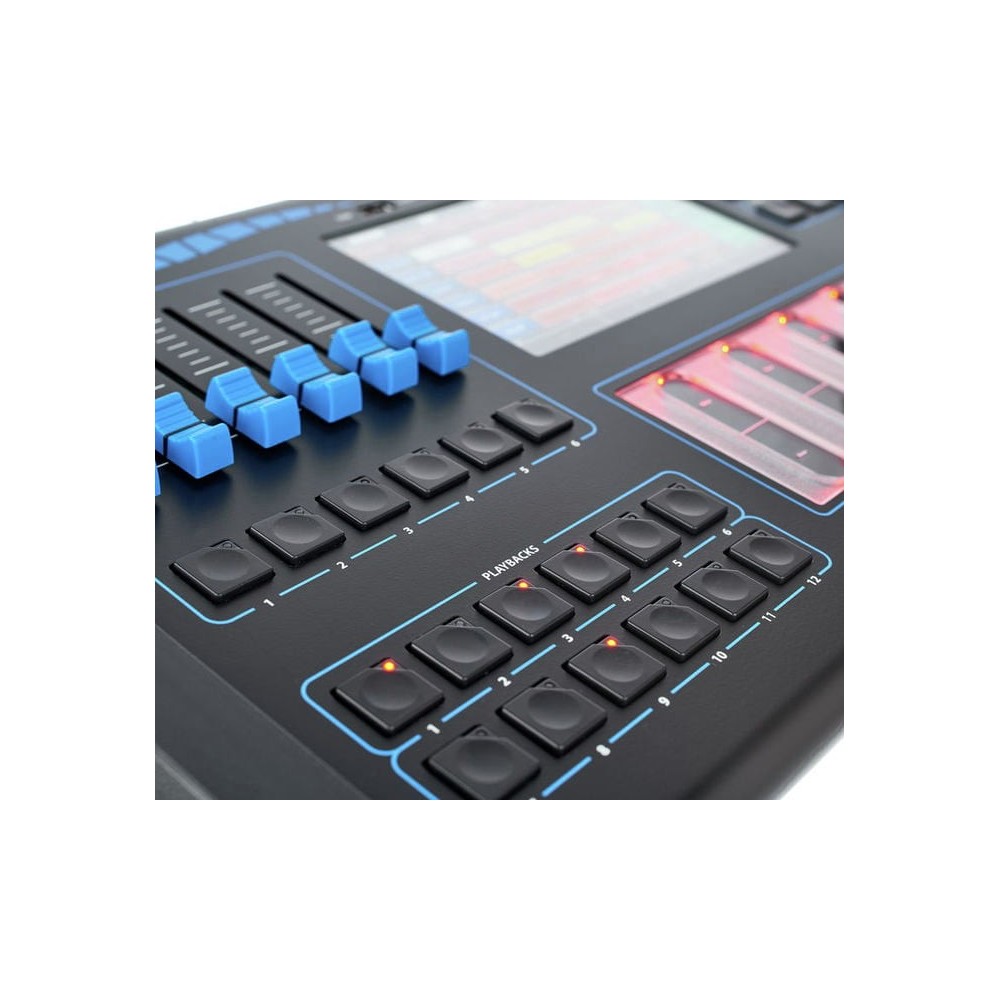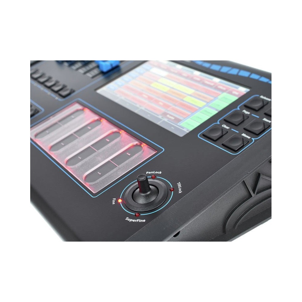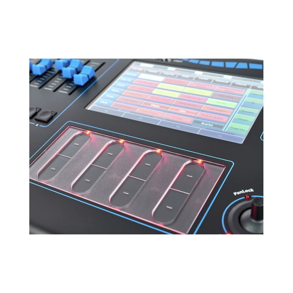a dodatkowo 4 enkodery dotykowe i multi-jog, którym wysterujemy urządzenia inteligentne takie jak skanery i ruchome głowy. Z poziomu wyświetlacza możemy łatwo zaprogramować wszystkie enkodery i przyciski.