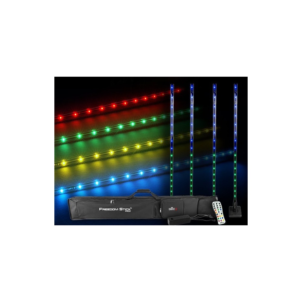 Freedom Stick Pack to nowość na rynku Mobilnych DJ. Jest to połączenie 4 niezależnych słupków- matryc LED RGB o wysokości 155cm każda, sterowanych i zasilanych całkowicie bezprzewodowo- urządzenia mają wbudowany akumulator wystarczający nawet na 6,5 godziny świecenia i posiadających bezprzewodowy system sterowania D-Fi. Dzięki możliwości odłączenia metalowej podstawy, można je montować również na kratownicy (uchwyty nie wchodzą w skład zestawu). Dzięki wielu automatycznym programom użytkownik ma do dyspozycji wiele konfiguracji świecenia, jak również może tworzyć sekwencje pikseli dopasowane do własnych upodobań i wizualizacji. Dodatkowe opcje sterowania obejmują tryby auto, reakcji na dźwięk, oraz gotowych programów za pośrednictwem bezprzewodowego DMX, trybu Master/Slave, lub pilota IRC-6. W zestawie znajduje się dedykowana torba transportowa, oraz multi- ładowarka.