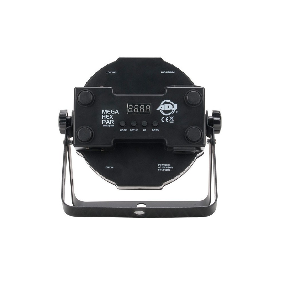 The ADJ Mega Hex Par is a compact, low profile par designed for up lighting and stage lighting, and will bring color and excitement to any event. This fixture features ADJ’s patented “sit-flat” design so that it may sit directly on the ground or inside truss without the scissor yoke because the power & DMX ins and outs are mounted on the side of the fixture, not on the rear.