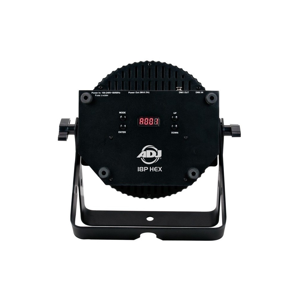 18P Hex od ADJ to silna lampa typu PAR o mocy 216W z obudową z metalu wyposażona w 18 diod 6-IN-1 HEX o mocy 12W każda. Dzięki 30-stopniowemu kątowi świecenia użytkownicy mogą oświetlać duże powierzchnie (wash) płynnie mieszając kolory wybierając z pomiędzy 63 wbudowanych makr i wykorzystując diody czerwoną, zieloną, niebieską, bursztynową, białą oraz UV. Urządzenie spisuje się doskonale do oświetlania sceny, ale również, dzięki opatentowanej nowatorskiej budowie i wejściom zasilania i DMX, nadaje się do pionowego oświetlania budynków.
