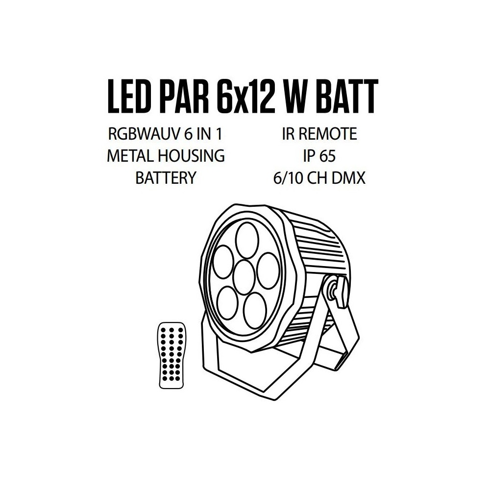 Wytrzymały i solidny LED PAR, zamkniety w szczelnej metalowej obudowie o stopniu szczelności IP65. Dołączony pilot pozwala na kontrolę parametrów urządzenia bez konieczności podłączania konsoli. Zainstalowana bateria pozwala na pracę przez parę godzin bez konieczności podłączenia do zasilania. Wielokolorowe diody RGBWAUV pozwalają na świecenie prkatycznie dowolną barwą.