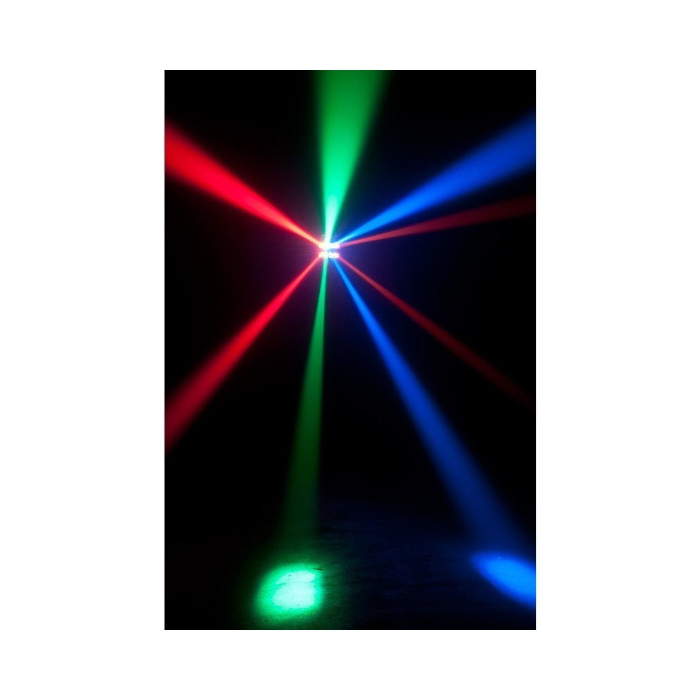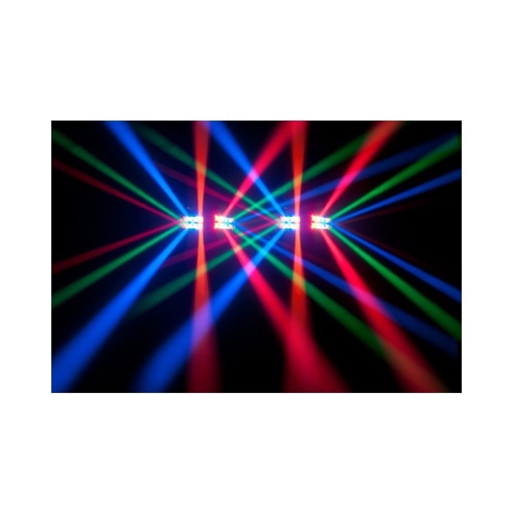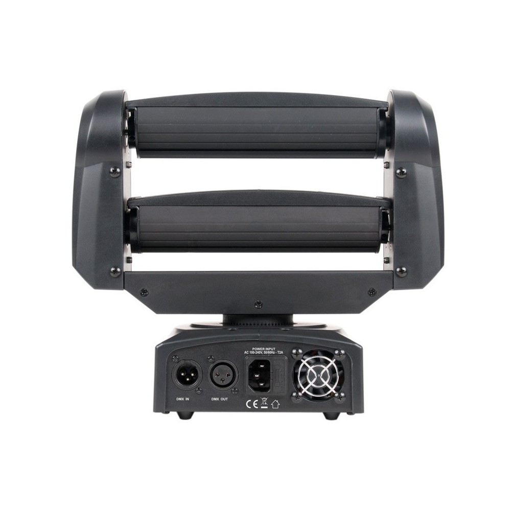 - Moving Head fixture with quick sweeping 8-Zone RGBA LED chase Dual LED Bars, each with 4 lenses, move independently