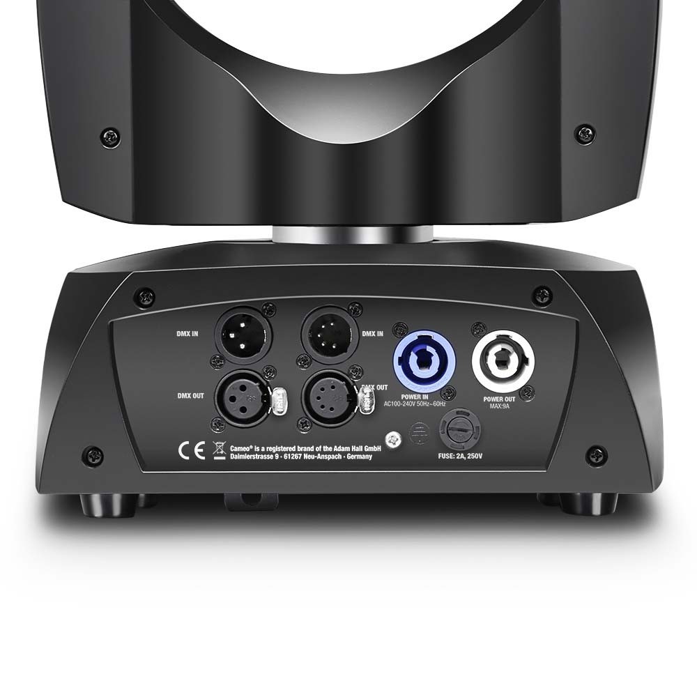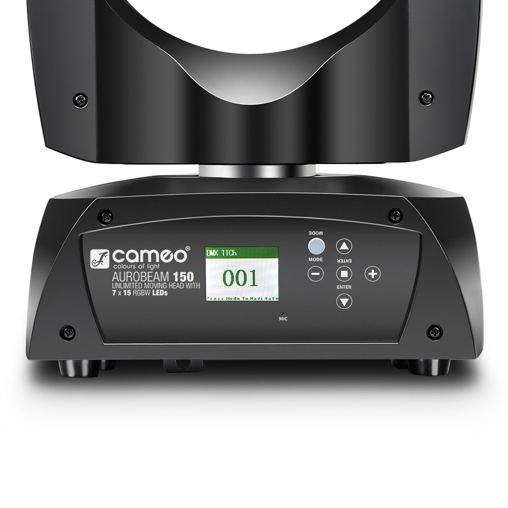 Urządzenie Cameo AURO® BEAM 150 to wyjątkowo szybka lampa PAR Moving Head o nieograniczonym ruchu PAN i TILT, z rozdzielczością 16 bitów oraz częstotliwością odświeżania na poziomie 3600 Hz. Siedem diod LED Quad o mocy 15 W zapewnia nasycone kolory R GBW, świeże odcienie pasteli i żywą gradację bieli przy kącie wiązki światła wynoszącym 12° oraz natężeniu światła 50 000 luksów. Kontrola na poziomie pojedynczych pikseli zapewnia spektakularne efekty mapowania pikseli. Profesjonalne wyposażenie lampy PAR AURO® BEAM 150 uzupełnia wyciszony wentylator sterowany temperaturą, gniazda sieciowe powerCON marki Neutrik oraz 3- i 5-stykowe wejścia i wyjścia dla sygnału DMX. Lampę PAR można stosować w trybie w pełni zautomat yzowanym, z programowalnymi scenami, w trybie sterowania muzyką lub jako urządzenie Standalone, Master lub Slave. Praca w trybie DMX możliwa jest dla 5, 11, 19 i 41 kanałów, m. in. z funkcjami ściemniania i lampy stroboskopowej. Solidna, czarna obudowa Cameo AURO® BEAM 150 z metalu oraz ABS posiada 6 przycisków oraz podświetlany wyświetlacz zapewniający komfort użytkowania. Lampa PAR Moving Head pracuje w zakresie 100–240 V. W zestawie znajduje się kabel sieciowy oraz uchwyt montażowy Omega.