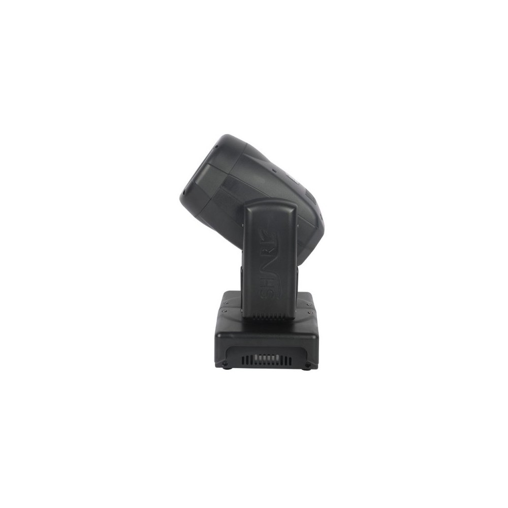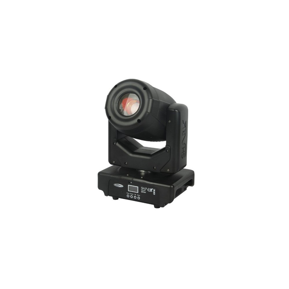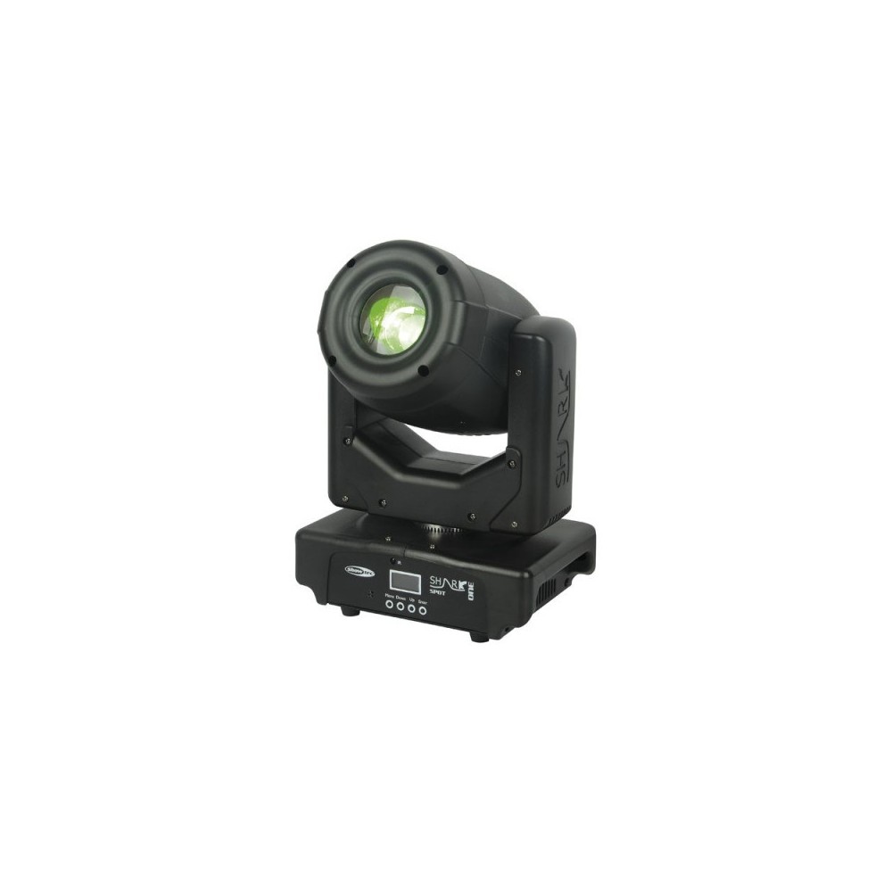 The Shark Spot One is a 60W LED moving head. It is a professional compact size moving spot light. Due to the sophisticated optics the Shark Spot One has a surprisingly bright output. Although its small size it offers great features such as a motorized focus, 3 facet prism, bi-rotating gobos and high grade dichroic filters. With only 6.2Kg and one clamp the fixture is easy in transportation and rigging. All effects and features can be controlled via DMX or with the included IR remote. The 8 channel personality makes it possible to control the Shark Spot One with a basic light desk, for full control there is an extended 14 channel personality. The sound mode and master slave function make it easy to generate music controlled shows without the need of programming.