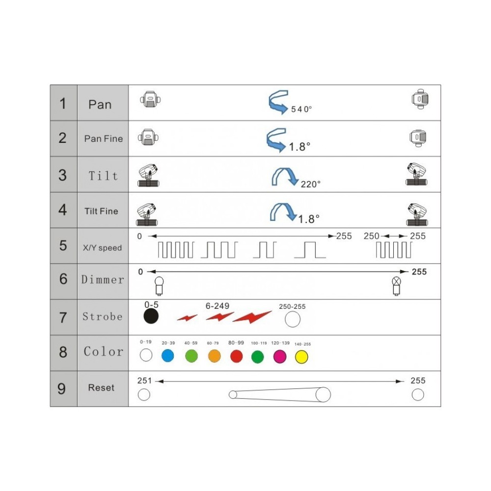 Ilość kanałów: 9 kanałów DMX
