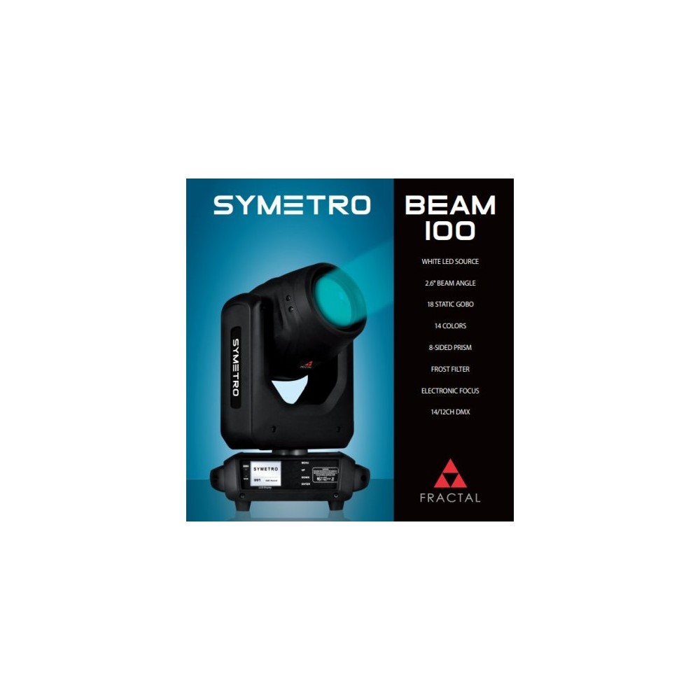 Najlepszy i najjaśniejszy, 100W głowica Beam z łatwością wchodzi w powietrze jak nóż w masło. Nowoczesne źródło 100W LED z białą diodą pozwala na uzyskanie nasyconych i ostrych wiązek, nawet przy użyciu 8-ściennej pryzmy. Dodatkowy filtr frost pozwala na rozmycie krawędzi światła. Mnogość gobo i kolorów czynią to urządzenie najlepszym dodatkiem do pozostałych opraw z serii Symetro.