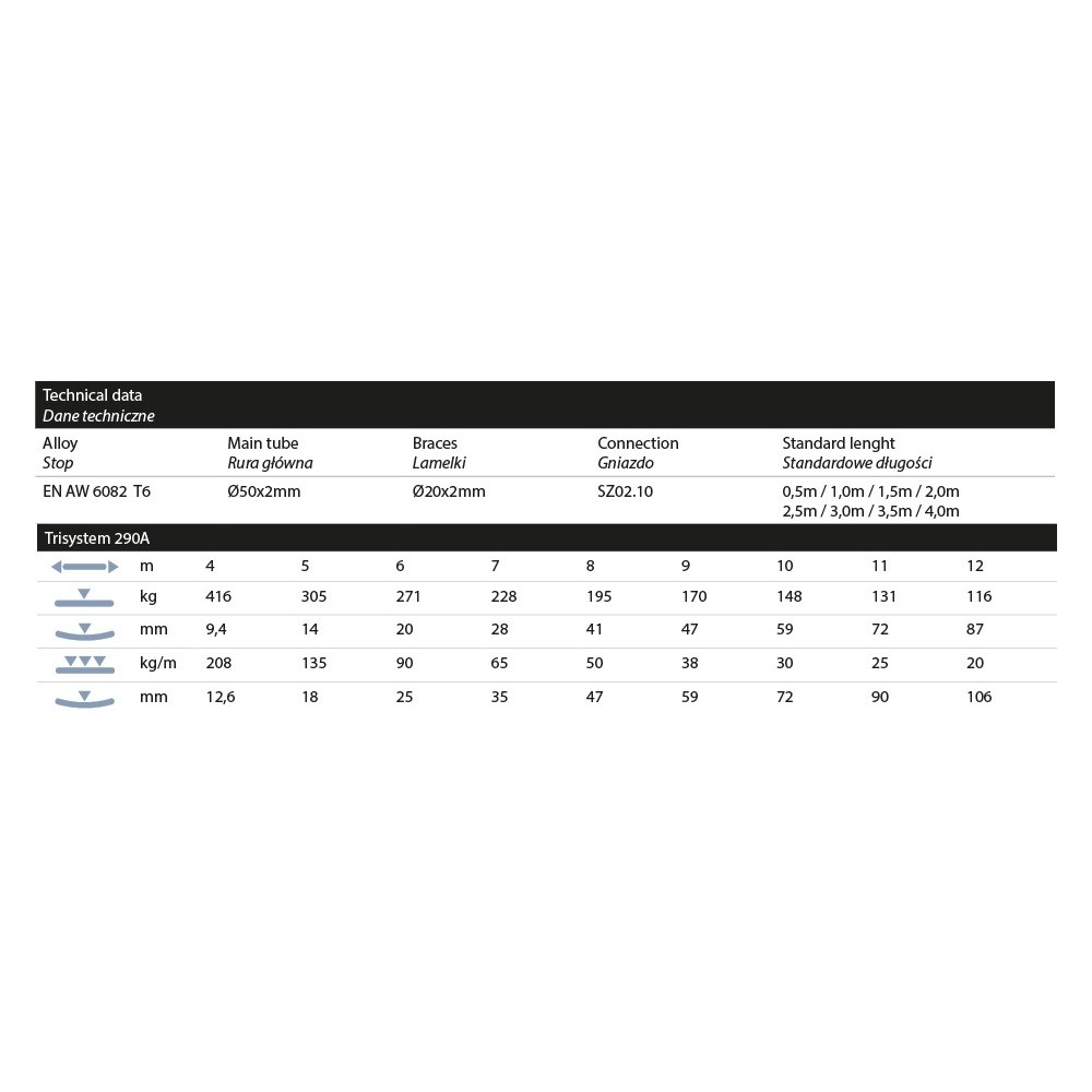 Alustage System 290A wykonany jest z rury 50x2mm oraz lamelek 20x2mm. Posiada gniazdo SZ02.10.
