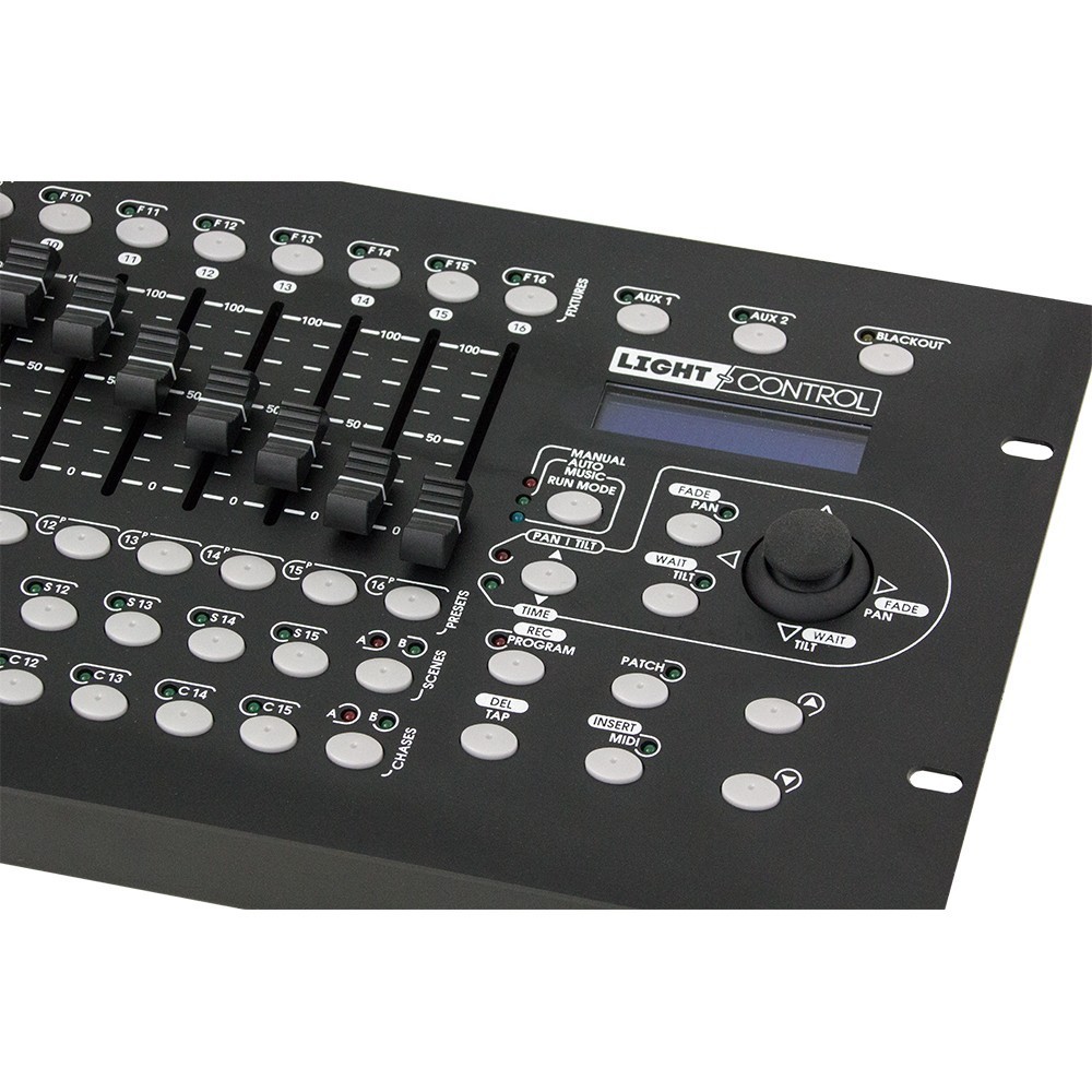 LIGHTControl posiada 16 suwakowów i joystick, dzięki czemu dostęp do wszystkich kanałów jest możliwy natychmiast i bez przewijania wielu stron. Szczególną innowacją jest funkcja "PRESET", która pozwala zdefiniować i nazwać 16 kanałów dla określonych funkcji. Funkcja jest wtedy wyświetlana na wyświetlaczu po przesunięciu suwaka (np. suwak kanału 5 dla "tarczy gobo" - na wyświetlaczu pojawia się informacja "GOBO"). W ten sposób eliminuje się często denerwujące "zgadywanie", która to funkcja jest prawdopodobnie kontrolowana. Dodatkowo, kanał 16 może być wykorzystany dla funkcji MASTER DIMMER, co jest zawsze użyteczne, jeśli urządzenia takiej funkcji nie posiadają. Każdy tłumik kanału można również przypisać do dowolnego kanału DMX. Na przykład, jeśli jesteś do tego przyzwyczajony, żożesz po prostu ponownie przypisać kanał do określonego kanału, nawet gdy dana funkcja nie jest w tym miejscu w przypadku kontrolowanego urządzenia.
